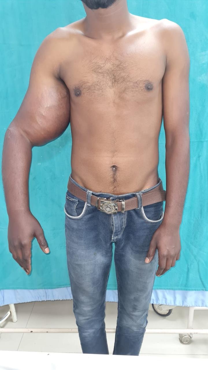 उत्तर प्रदेश के रामपुर के रहने वाले एक 25 वर्षीय मरीज के हाथ की कोहनी के पास गांठ (सॉफ्ट टिश्यू सार्कोमा) बन गई थी। धीरे-धीरे कुछ समय बाद इस गांठ में फैलाव होने लगा और गांठ का वजन बढ़ने के कारण मरीज को हाथ का मूवमेंट करने में परेशानी होने लगी। चिकित्सकों के मुताबिक इस गांठ ने ट्यूमर का रूप ले लिया था और इसका कैंसर में परिवर्तित होने का खतरा बना था। स्थिति गंभीर होते देख वहां के स्थानीय चिकित्सकों ने मरीज को बताया कि जीवन बचाने के लिए उसका हाथ काटना पड़ सकता है। ऐसे में आखिरी उम्मीद लिए यह मरीज एम्स ऋषिकेश पहुंचा। यहां संस्थान के आर्थोपेडिक और बर्न एंड प्लास्टिक सर्जरी विभाग के चिकित्सकों की टीम ने विभिन्न जांचों के बाद निर्णय लिया कि मरीज का हाथ और जीवन दोनों को बचाना जरूरी है। ऐसे में टीम ने री- कंस्ट्रक्शन सर्जरी करने का निर्णय लिया और 14 मार्च 2024 को इस रोगी की सर्जरी प्रक्रिया को बखूबी अंजाम दिया गया।